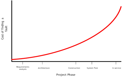 This is a well-known graph. It shows the (relative) cost of finding – and fixing – a fault in a system throughout the lifecycle of the project. In simple terms it shows that it can cost orders of magnitude more to find and fix a problem at the end of the development lifecycle than during the early stages; and even more once the project is in service.