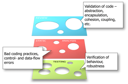 The “Swiss Cheese” approach to testing uses multiple techniques, each with a different focus. The techniques are applied with the clear knowledge that no technique is perfect (nor should it be) but the flaws in any one technique do not overlap (much!) with the flaws of another layer.