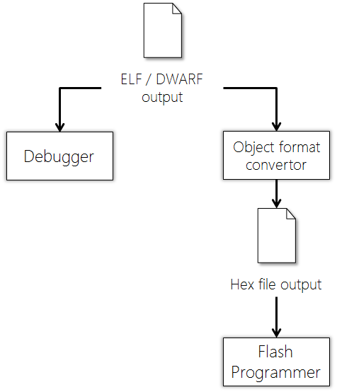 ELF or DWARF are target-independent output file formats. In order to be loaded onto the target the ELF file must be converted into a native flash / PROM format (typically, .bin or .hex)